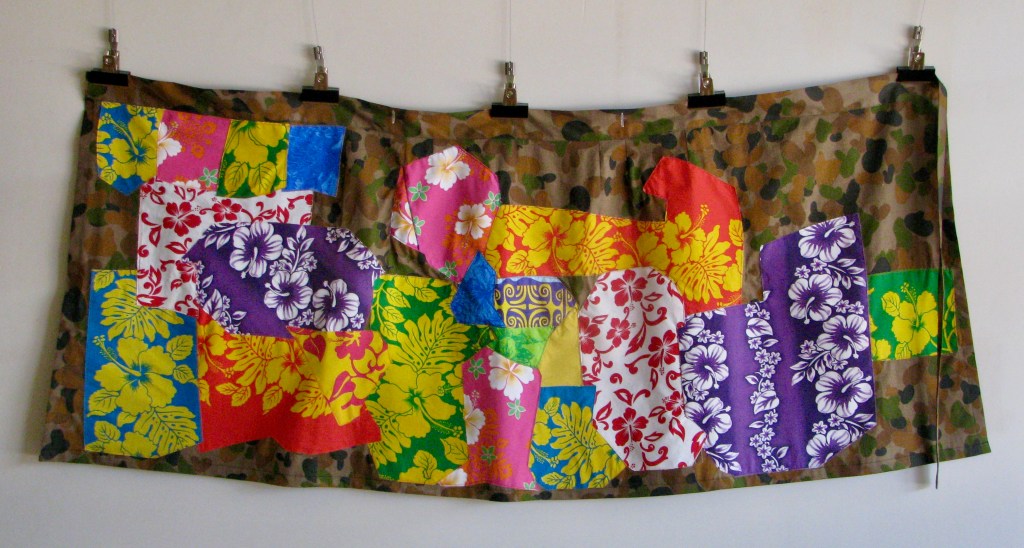 The patches representing the EEZ are made from classic floral ‘Island’ print, commonly found across the Pacific region, often a Polyester based textile designed, produced and exported from China. The base fabric is the Australian Defence Force military camouflage nicknamed AUSCAM. At the time that this work was made, RAMSI (Regional Assistance Mission to Solomon Islands) was creating a kind of neo-colonial presence in the Pacific region for Australia and New Zealand. Both the AUSCAM and the China-made ‘Island’ prints represented significant social, political and economic forces at play shaping the Pacific region both directly and indirectly.