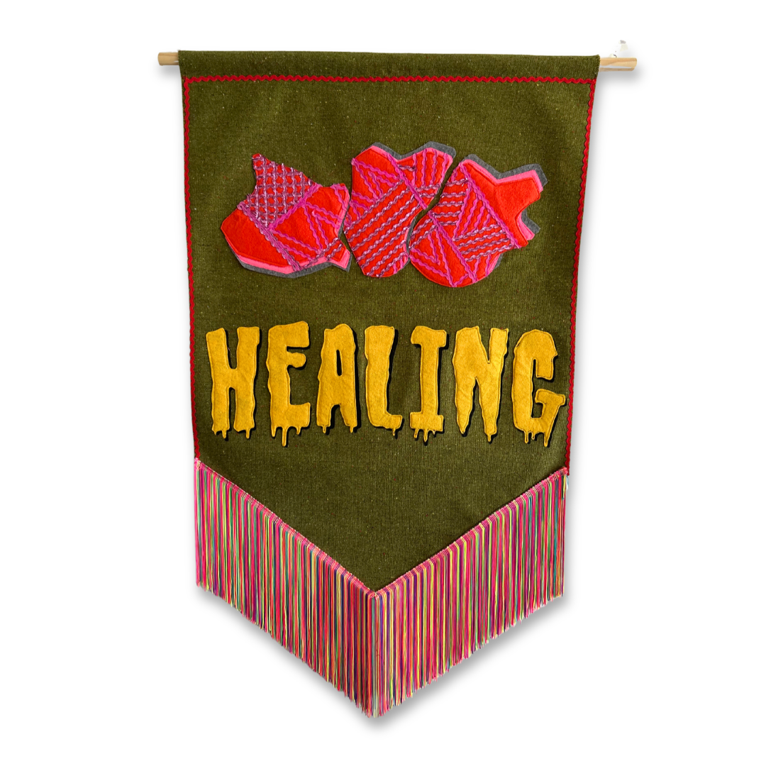 Textile assemblage: Wool blend base backed with fusible interfacing, synthetic felt, ric-rac trim, multicoloured fringe and cotton thread. Work hangs on EcoPine dowel with zinc-coated screw eye hooks, 1000x605mm.