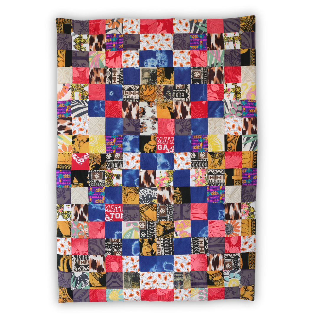 Patchwork quilt, 206 squares of collected textiles, 10oz synthetic wadding, calico, Mother of Pearl shell buttons, 1210x1680mm.