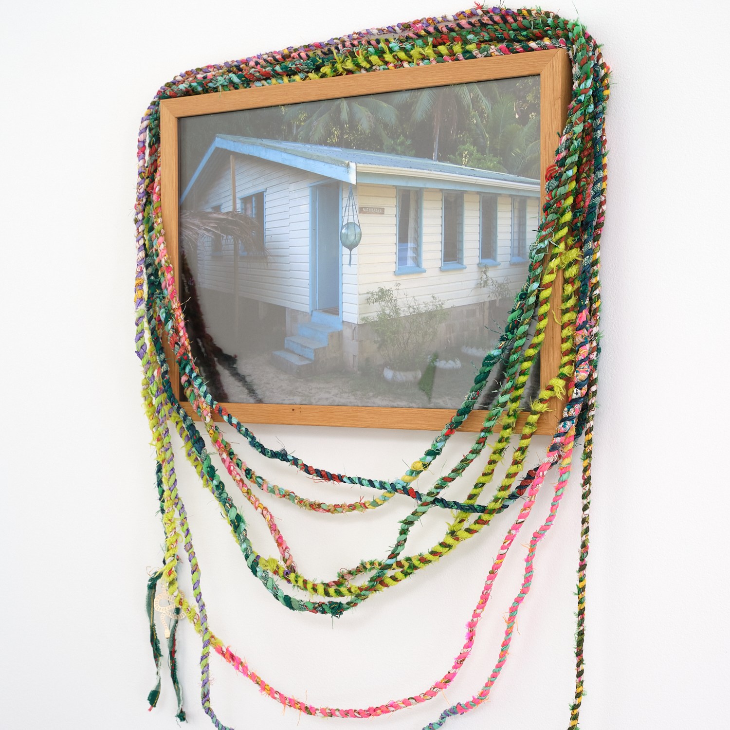 Framed digital photograph, adorned with hand-twisted cord and found objects.