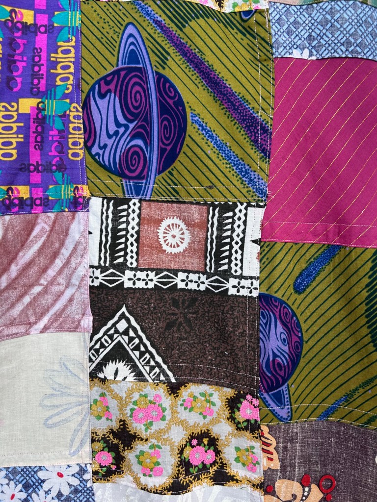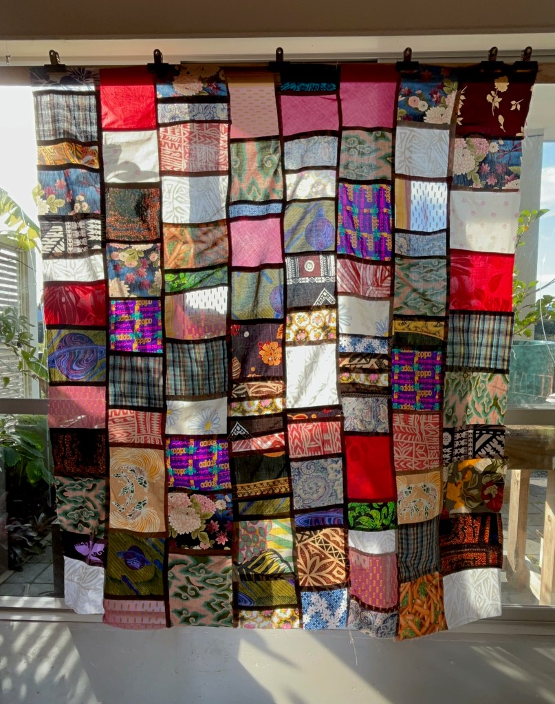 Made of silks and cottons, elei fabrics, sari, chunky cotton dobby, bedspreads softened from a 100 washes, African wax print and textiles gifted and collected over 30 years. A patchwork portrait in cloth.